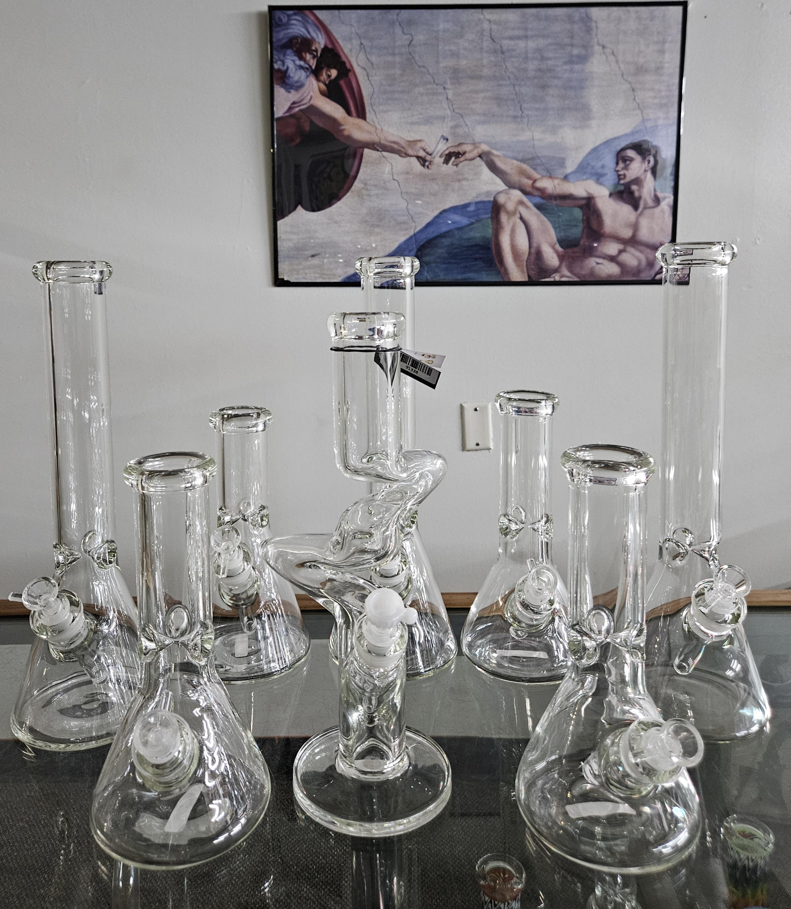 Clear Glass water pipes--$55 for the Short and Stout, $75 for the Tall Boy and $100 for the Zog.